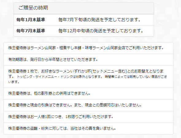 株主優待券はラーメン山岡家、極煮干し本舗、味噌ラーメン山岡家全店で利用可能で、優待券1枚でお好きなラーメン1杯とのお取替えとなります。