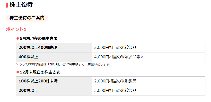 ただし、100株保有でお米がもらえるのは12月権利分のみとなっており、6月権利分に関しては200株以上の保有で対象となっています。