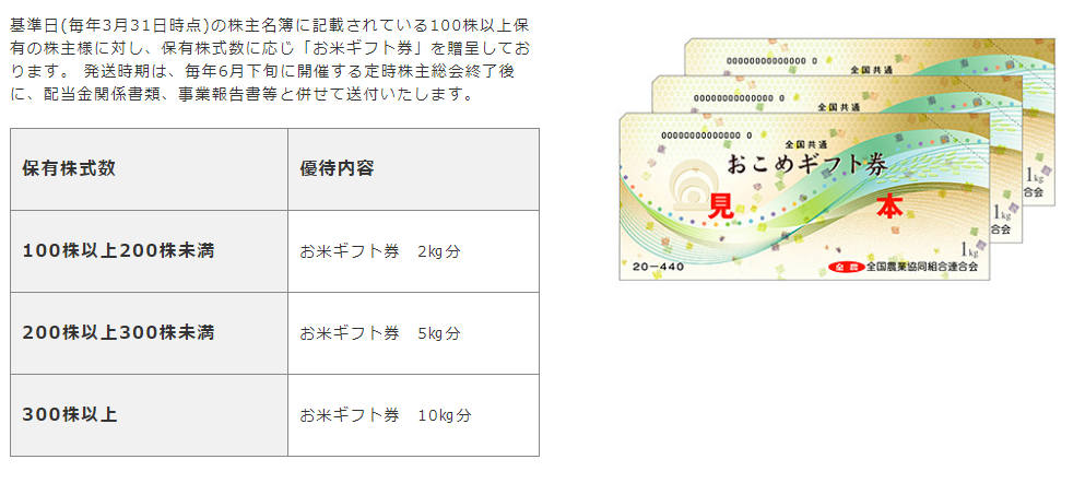100株保有でお米ギフト券2キロ分が贈呈されます。