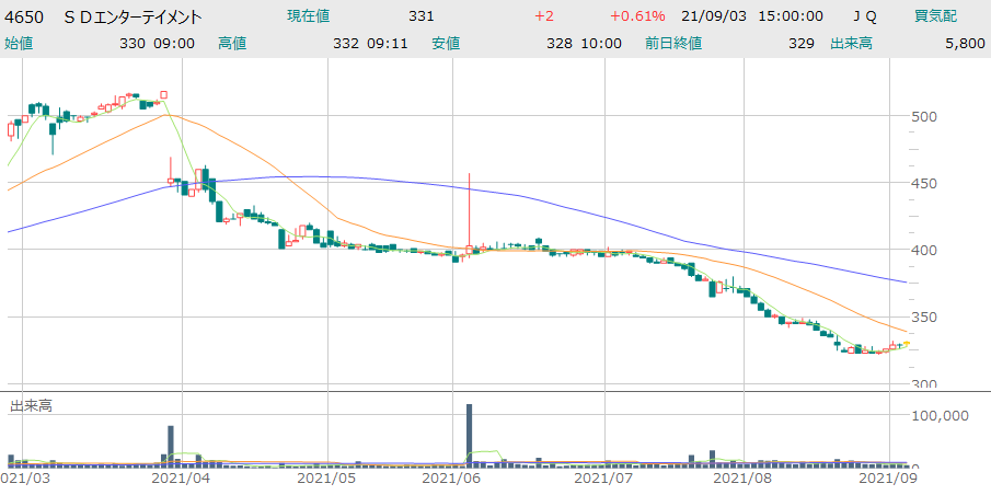ゲームセンター事業・ボウリング事業・シネマ事業といったエンターテイメント事業を譲渡撤退し、フィットネス事業や保育事業、介護事業など展開しているSDエンターテイメントですが、コロナ影響の大きい事業ということで直近は沈んでいました。