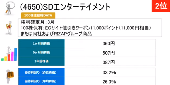 権利確定月は年1回、3月末日で、優待品は100株保有で11,000ポイント、ですので11,000円相当のECサイト値引きクーポン、または同社およびRIZAPグループ商品で優待カタログからお好きな商品を選ぶことができます。