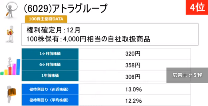 権利確定月は12月で、100株で同社取扱商品の中から4000円相当の商品が贈呈されます。