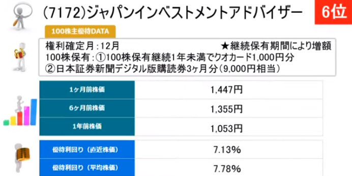 権利確定月は12月で、100株保有継続1年未満でクオカード1000円分、あわせて日本証券新聞デジタル版購読券3ヶ月分(9000円相当)が贈呈されます。