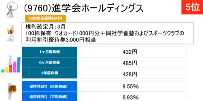権利確定月は3月で、100株保有で1000円分のクオカードが贈呈、さらに、希望される株主には同社学習塾およびスポーツクラブの利用割引優待券3000円相当が贈呈されます。