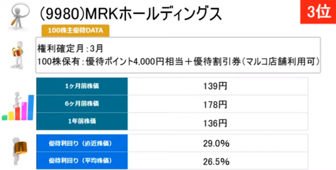 権利確定月は年1回、3月末で、優待品は100株保有で4000円相当の優待ポイントに加え、マルコ店舗で利用可能な優待割引券が贈呈されます。