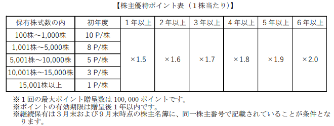 権利確定月は3月で、100株保有で優待ポイントが贈呈されますが、継続保有期間に応じて変動する優待ポイントとなっています。