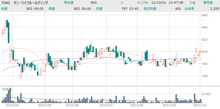 2021年10月1日時点で株価は800円ですので、100株取得の最低投資金額は80,000円となります。