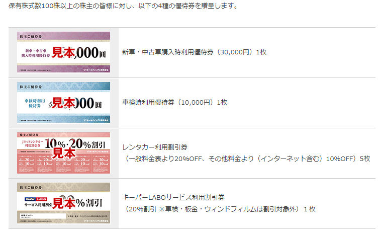 権利確定月は3月で、100株保有で次の4種の優待券が贈呈されます。