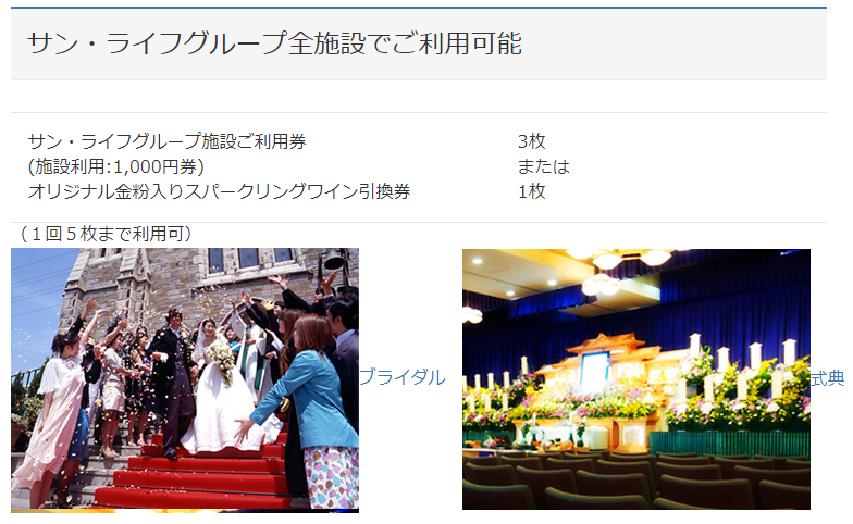 サン・ライフグループ全施設で利用可能な優待券1,000円券が3枚、または、オリジナル金粉入りスパークリングワイン引換券1枚と引き換え可能