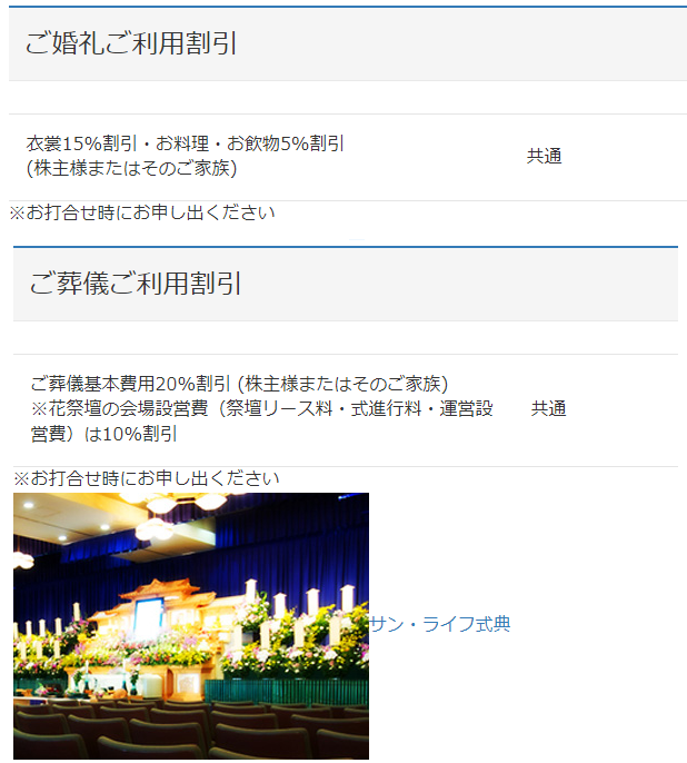 こちらは、株主またはそのご家族対象の葬儀基本費用20%割引、祭壇リース料など会場設営費は10%割引となります。