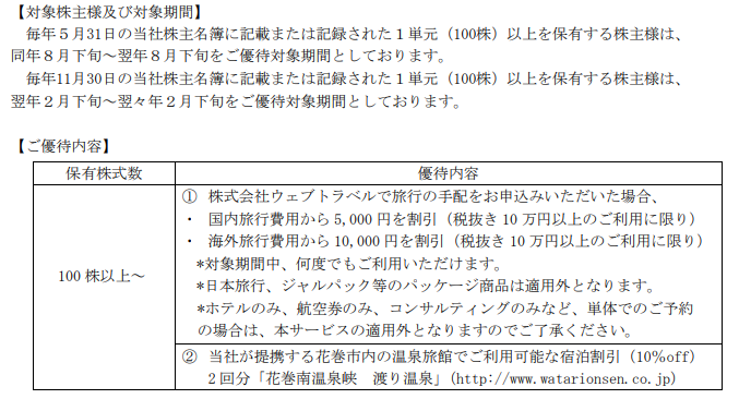 権利確定月は5月と11月で、100株保有で国内外旅行費用割引優待、提携の国内温泉旅館で利用可能な宿泊割引優待となっています。
