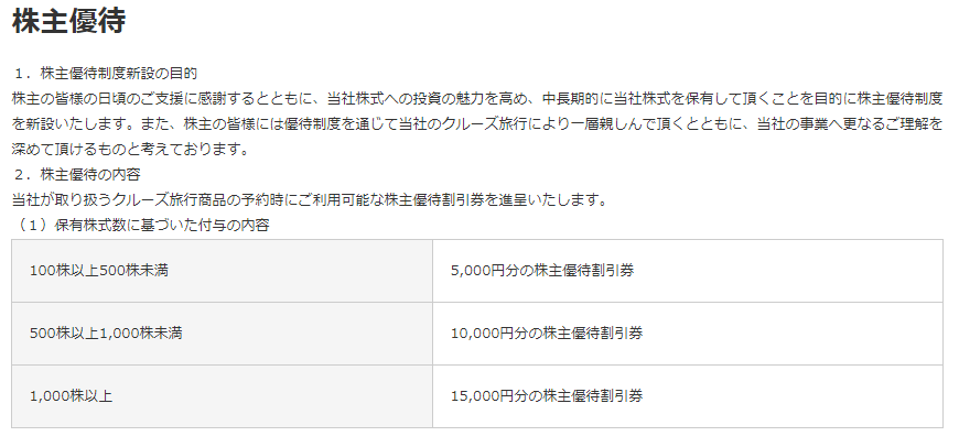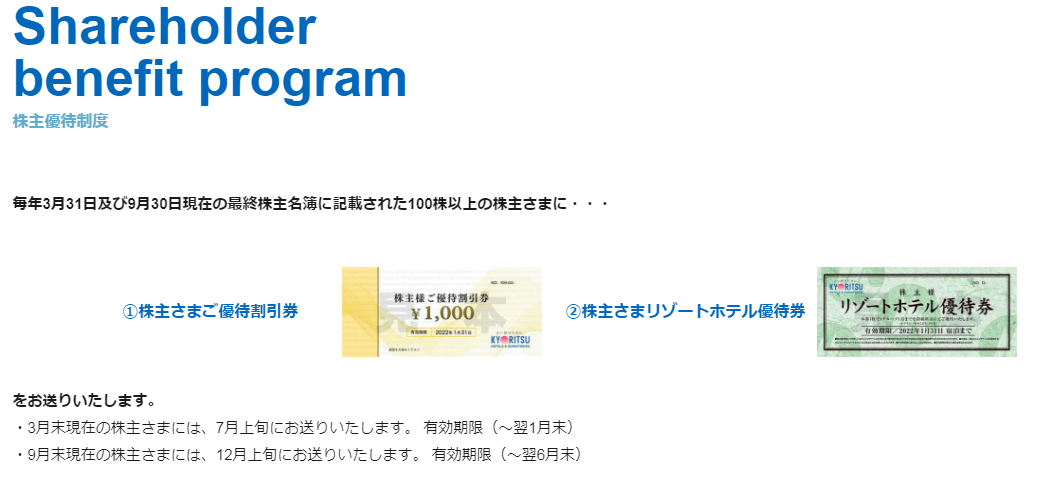 優待の権利確定月は3月と9月で、100株保有で、株主優待割引券が年間で2枚、リゾートホテル優待券が年間で4枚贈呈されます。