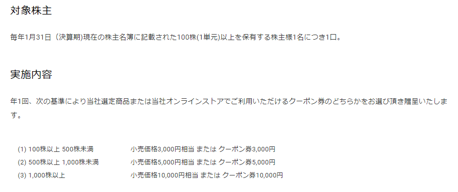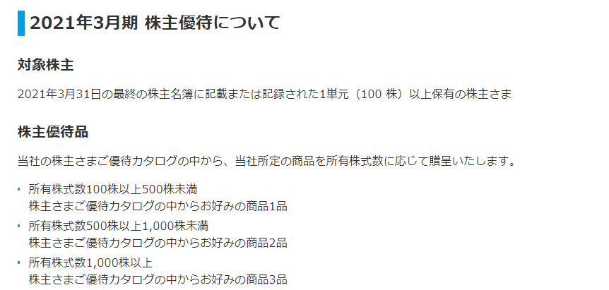 優待の権利確定月は3月で、100株保有で株主優待カタログの中からお好みの商品1品を選択し、贈呈される流れとなっています。