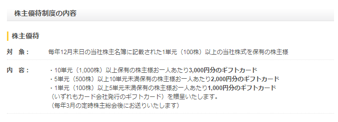 優待の権利確定月は12月で、100株保有でカード会社発行のギフトカード・1000円分が贈呈されます。