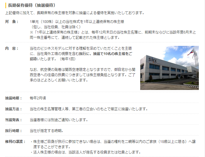 抽選で10名の株主は、シークスの海外工場の視察を含む旅行に招待されます。