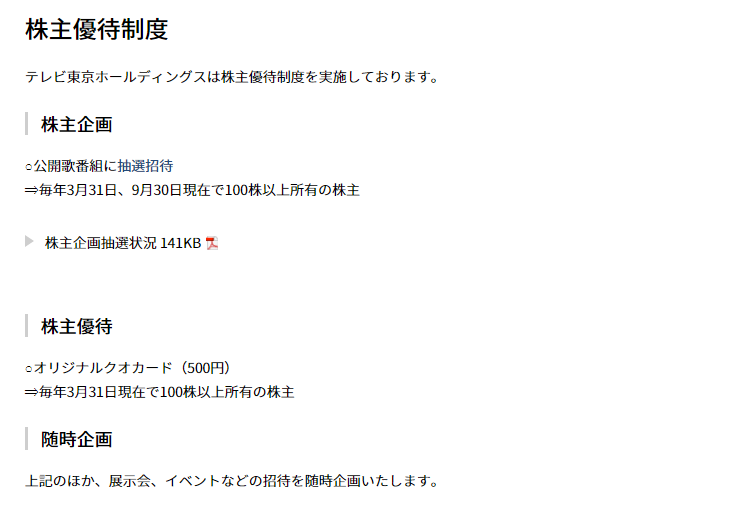 また、3月・9月権利月対象の株主には株主企画として「年忘れにっぽんの歌」など公開歌番組に抽選招待が過去には実施されています。