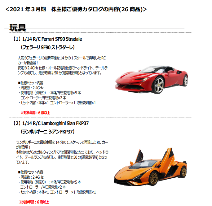 フェラーリ・ランボルギーニなどの玩具や、ニンテンドースイッチのソフト、DVD・ブルーレイなどの映像作品と、幅広いラインナップとなっていました。