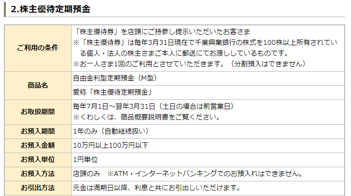 優待の権利確定月は3月で、100株保有で「株主優待券」、こちらは商品名「株主優待定期預金」の株主優遇金利となっています。