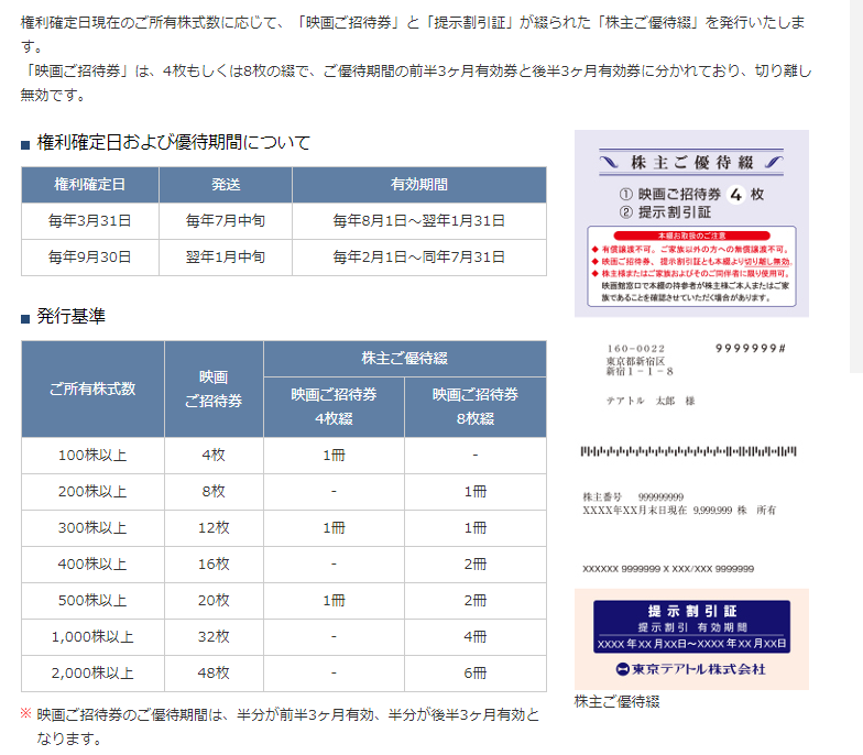 優待の権利確定月は3月と9月で、100株保有で「映画ご招待券」4枚つづり1冊が発行されます。
