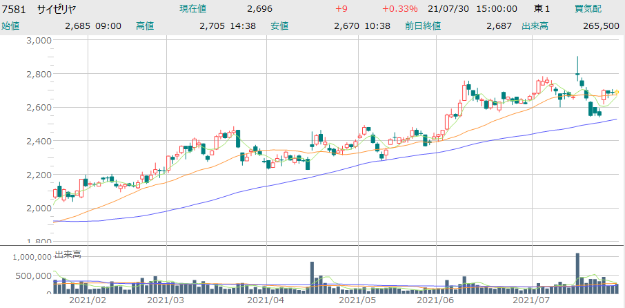 2021年7月30日時点で株価は2696円ですので、100株取得の最低投資金額は26万9600円となります。