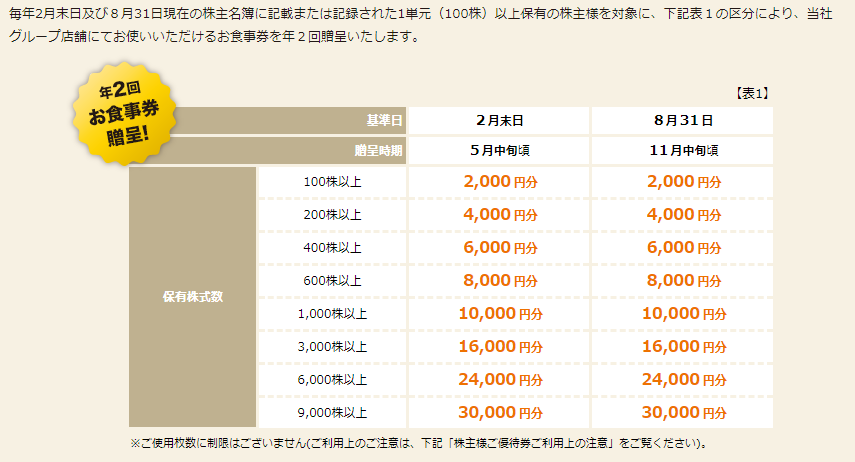権利確定月は2月と8月で、毎年2月末日、および8月31日現在の株主名簿に記載された株主対象に100株保有で2000円分のお食事券が贈呈されます。