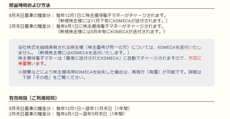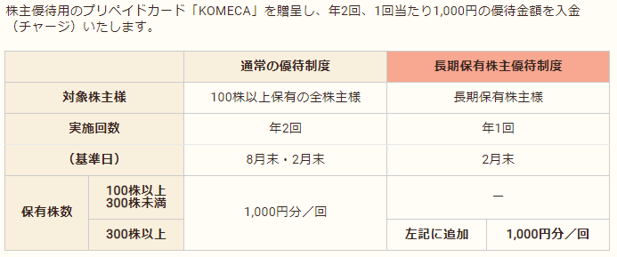 権利確定月は2月と8月で、2月末・8月末を基準日とし、100株保有で株主優待用のプリペイドカード「KOMECA」が贈呈され、年に2回、1回あたり1000円の優待金額がチャージされます。