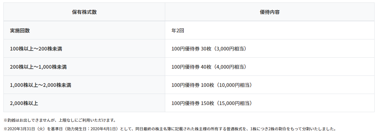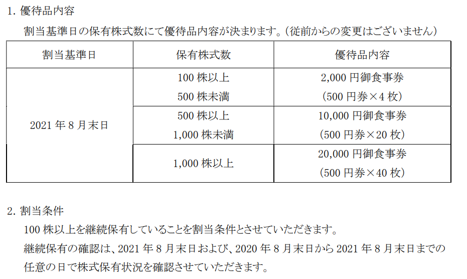 権利確定月は8月で「8月末日」を割当基準日として、100株保有で継続保有、前年8月末~当年8月末までの任意の日で保有状況が確認された株主を対象に500円券が4枚、計2000円分の食事券が贈呈されます。