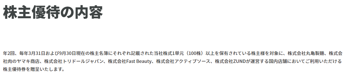 権利確定月は3月と9月で、毎年3月31日および9月30日現在の株主名簿に記載された株主対象に、100株保有でトリドールグループの店舗で利用できる100円優待券30枚が贈呈されます。