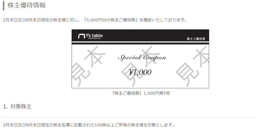 権利確定月は2月と8月で、2月末日および8月末日現在の株主対象に100株保有で優待券1000円券が5枚贈呈されます。