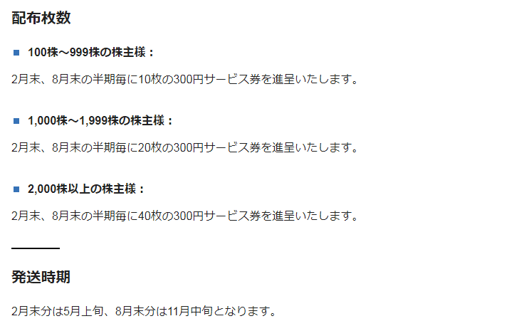 権利確定月は2月と8月で、「2月末」「8月末」の半期毎に100株保有で300円サービス券10枚が進呈されるので、年間6000円分のサービス券が進呈されることになります。