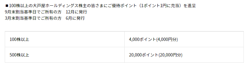100株保有で4000ポイント、1ポイント1円に充当するので4000円分、年2回ですので、年間で8000円分贈呈されることになります。