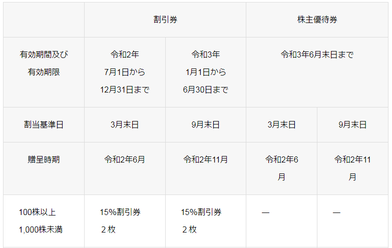 権利確定月は3月と9月で「3月末日」「9月末日」を割当基準日に100株保有で「15%割引券2枚」となっており、年間2回贈呈されます。
